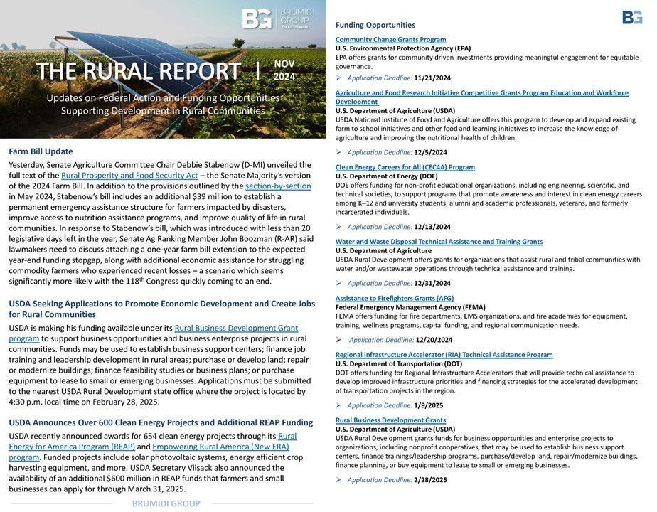 Rural Report | November 2024Brumidi TeamNov 19, 20241 min readUpdated: Jan 16, 2025Check out the newest issue of the #RuralReport for updates on the Farm Bill, USDA clean energy and economic development funding announcements, and more.Click here to download the full PDF version of the Rural Report.
